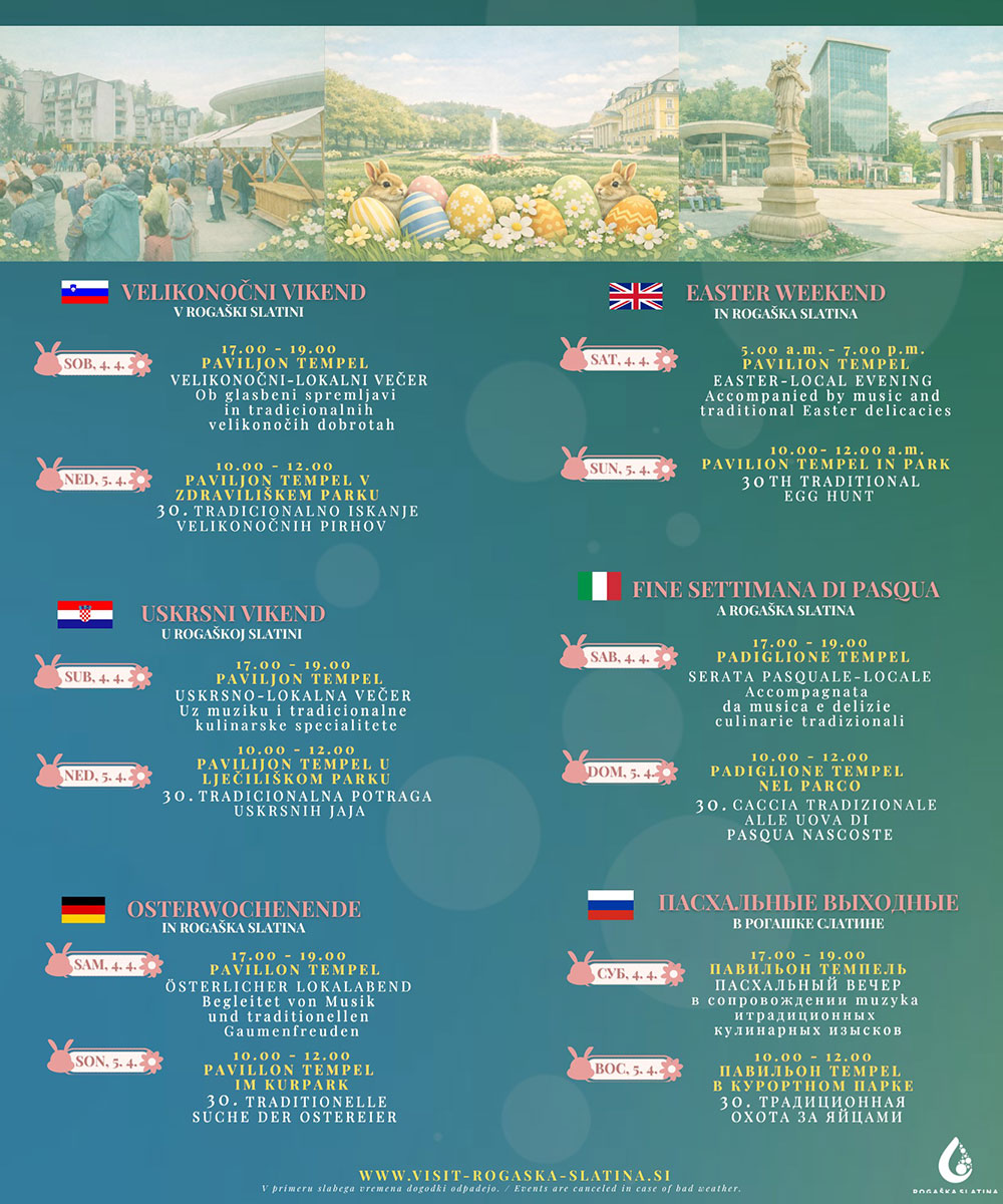 Rogaška Slatina liegt versteckt in einem grünen Tal und bietet mit seinem weltberühmten heilenden Mineralwasser und einem milden Klima schon seit alters her gesunde Entspannung, Ruhe, Harmonie und Wohlbefinden. Heutzutage ist Rogaška Slatina ein attraktives Ziel für alle, die die heilende Wirkung des Mineralwassers Donat Mg probieren und Wohlbefinden, Ruhe in schöner Natur und ein reiches kulturelles Angebot erleben wollen. Dies ist ein Ort für Treffen, bei denen man neue Bekanntschaften macht und wo die Menschen der Wunsch nach Qualität, Gesundheit und erholsamen Urlaub verbindet. Dies sind nur einige der Gründe für einen Besuch der Heilbrunnen, die sich in dieser kleinen Stadt im Osten Sloweniens befinden.